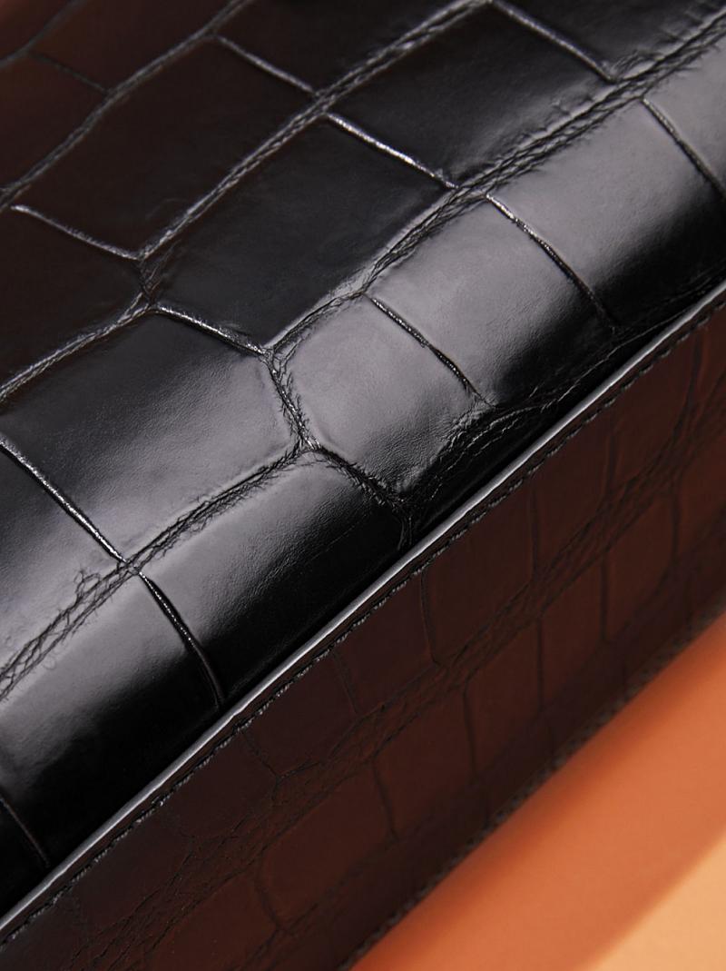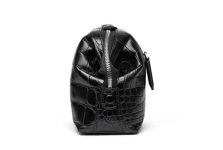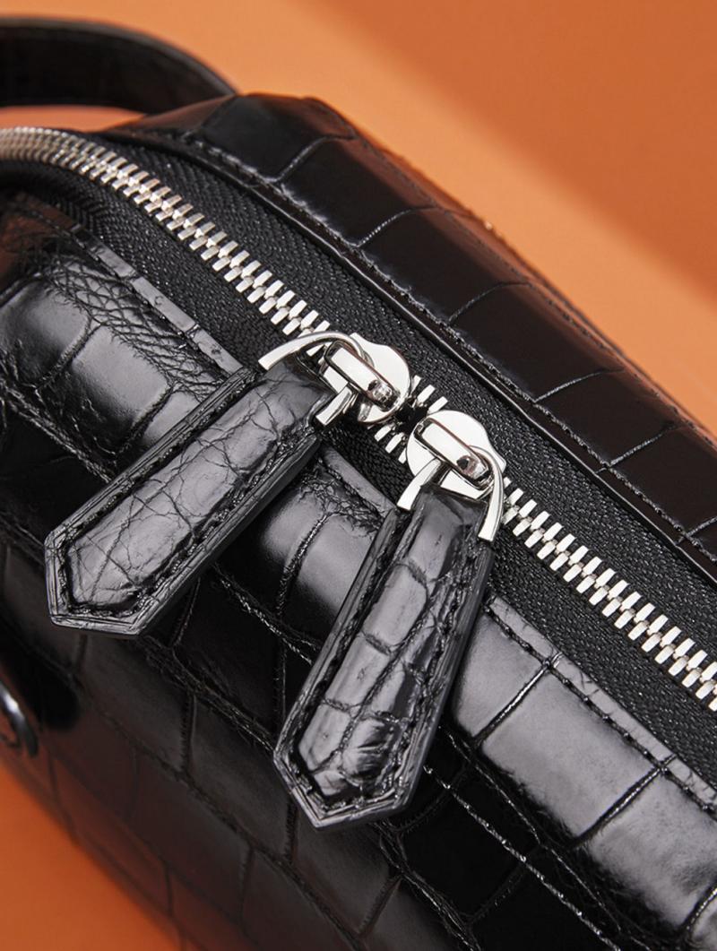 Premium metallic zippers on this alligator leather bag make it attractive and add to the overall quality. These zippers are accompanied by alligator leather zipper handles to match the overall aesthetic of the bag.