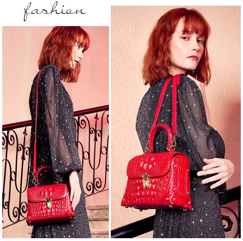 . Outer Material: crocodile skin very wear-resistant and not deformation, the skin texture is very vivid and natural; soft luster will never fade; the bone spur in head and back make bags more dignity.